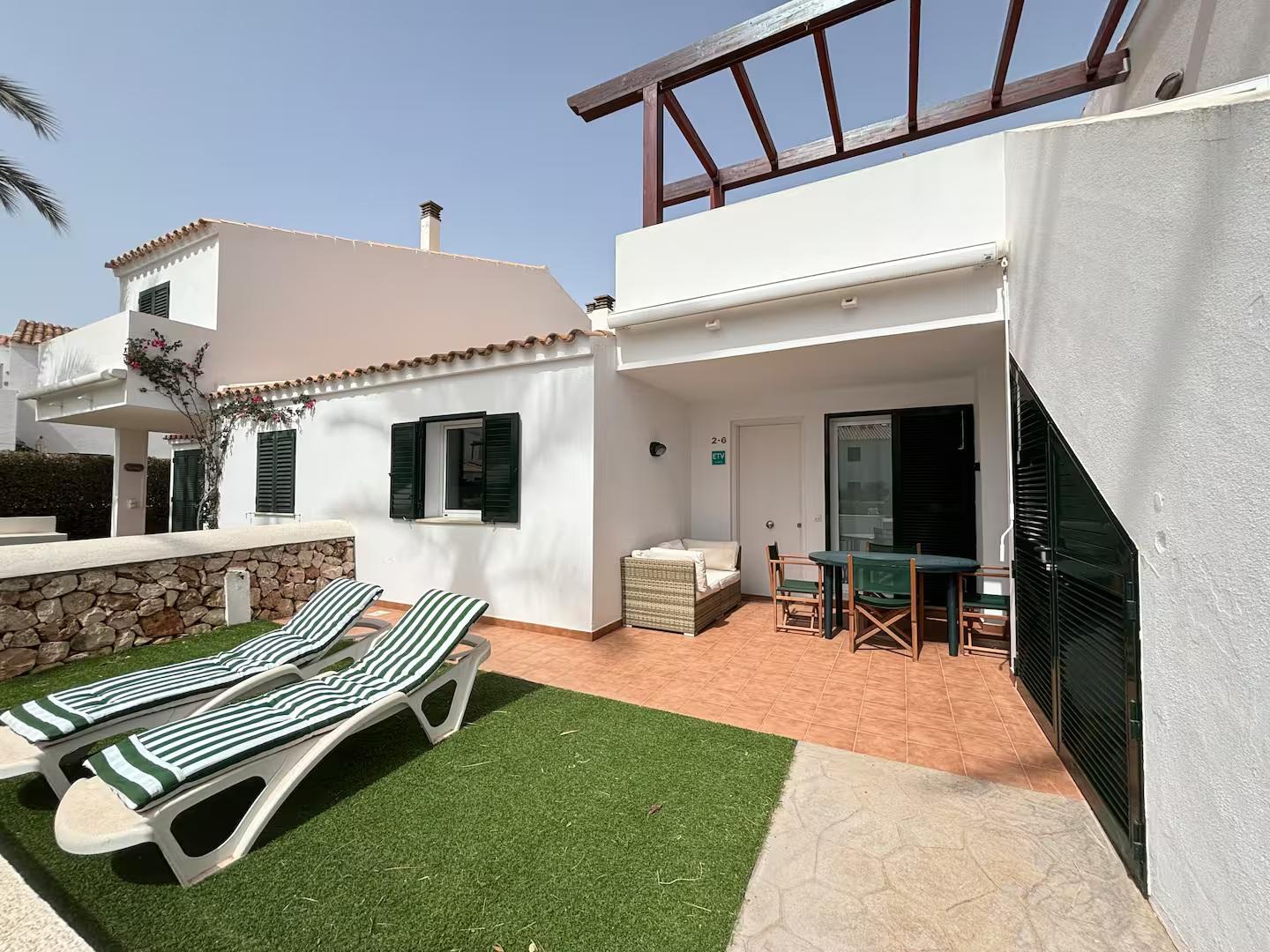 La terraza privada, con zona de mesa y sillas y otra con césped y tumbonas, ofrece vistas a la piscina.